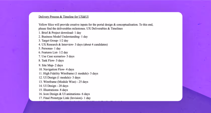 Yellow Slice is an award-winning design agency with a massive portfolio of working with clients from different industries ranging from Fintech and BFSI to Healthcare and Ed-Tech. Our team of expert designers will help you bring your product vision to life with the help of UI/UX solutions (they will also help you create a design brief for your project).